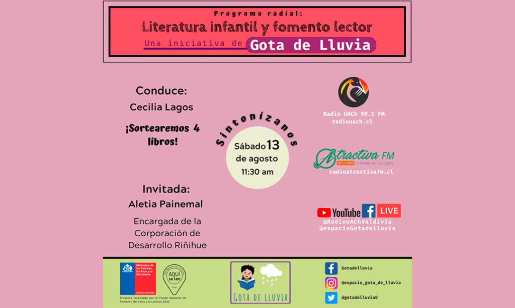 Cada sábado, a las 11.30 am, a través de radio Atractiva de Los Lagos, de la radio Universidad Austral de Chile (actualmente cerrada por huelga de académicos y funcionarios) y de la plataforma Spotify; se emite el Ciclo radial Gota de Lluvia que este 2022 se ha dedicado a visibilizar el trabajo de distintas mujeres que tienen un importante rol en el fomento y la mediación lectora, específicamente, en Valdivia y Los Lagos.