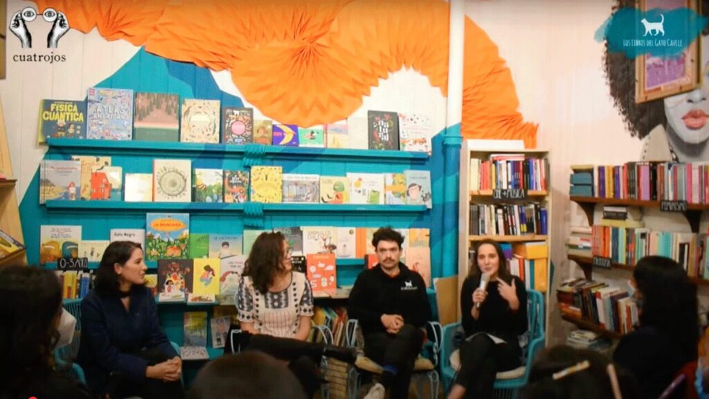 La sesión presencial para el cierre de este proyecto, transmitida por las RRSS de Cuatro Ojos, contó con la participación de Boris Farías, librero y cofundador de la Librería Gato Caulle; María José Navia, académica y escritora; junto a Melissa Cárdenas y Paloma Mas, co-fundadoras de Cuatro Ojos y ejecutoras del proyecto de Clubes de lectura.